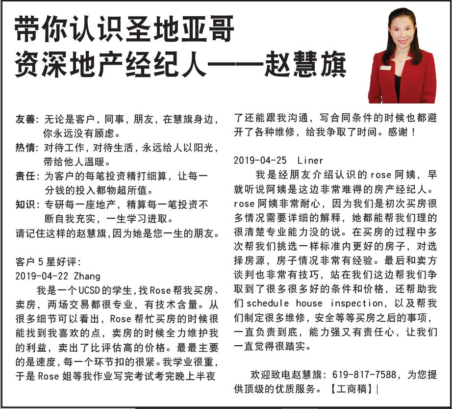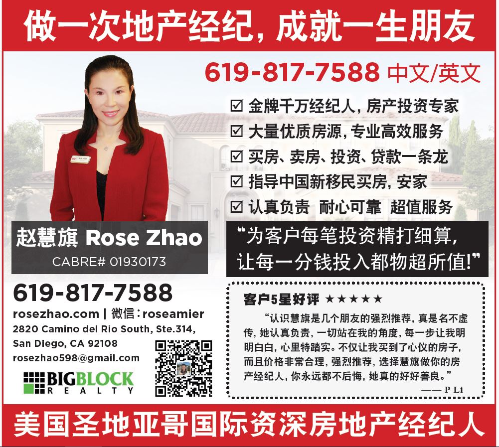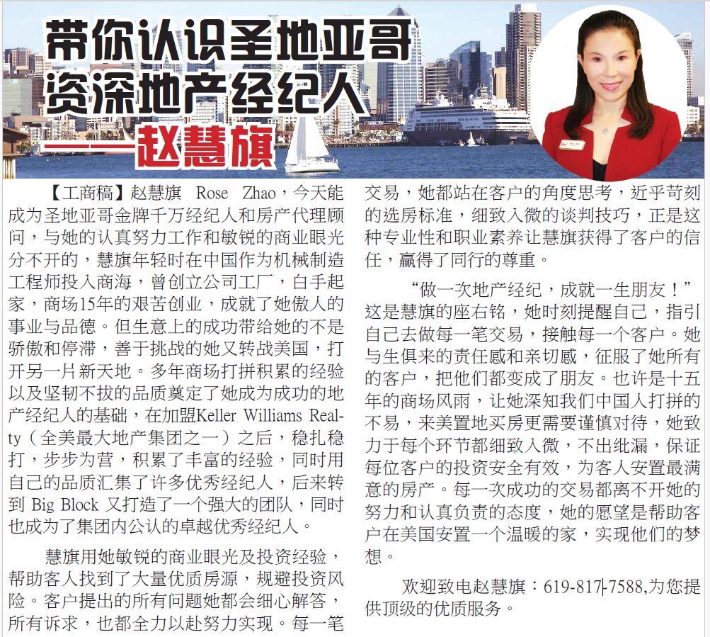 趙慧旗 地產經紀人 2025年8月1日 便民資訊, 教學招生 趙慧旗 Rose Zhao CABRE# 01930173 做一次地產經紀,成就一生朋友 • 金牌千萬經紀人,房產投資專家 • 大量優質房源,專業高效服務 • 買房、賣房、投資、貸款一條龍 • 指導中國新移民買房,安家 • 認真負責 耐心可靠 超值服務 619-817-7588 rosezhao.com 2820 Camino del Rio South, Ste.314, San Diego, CA 92108 rosezhao598@gmail.com Post Views: 1,262 投資,貸款聖地亞哥 ,地產經紀人,買房,賣,